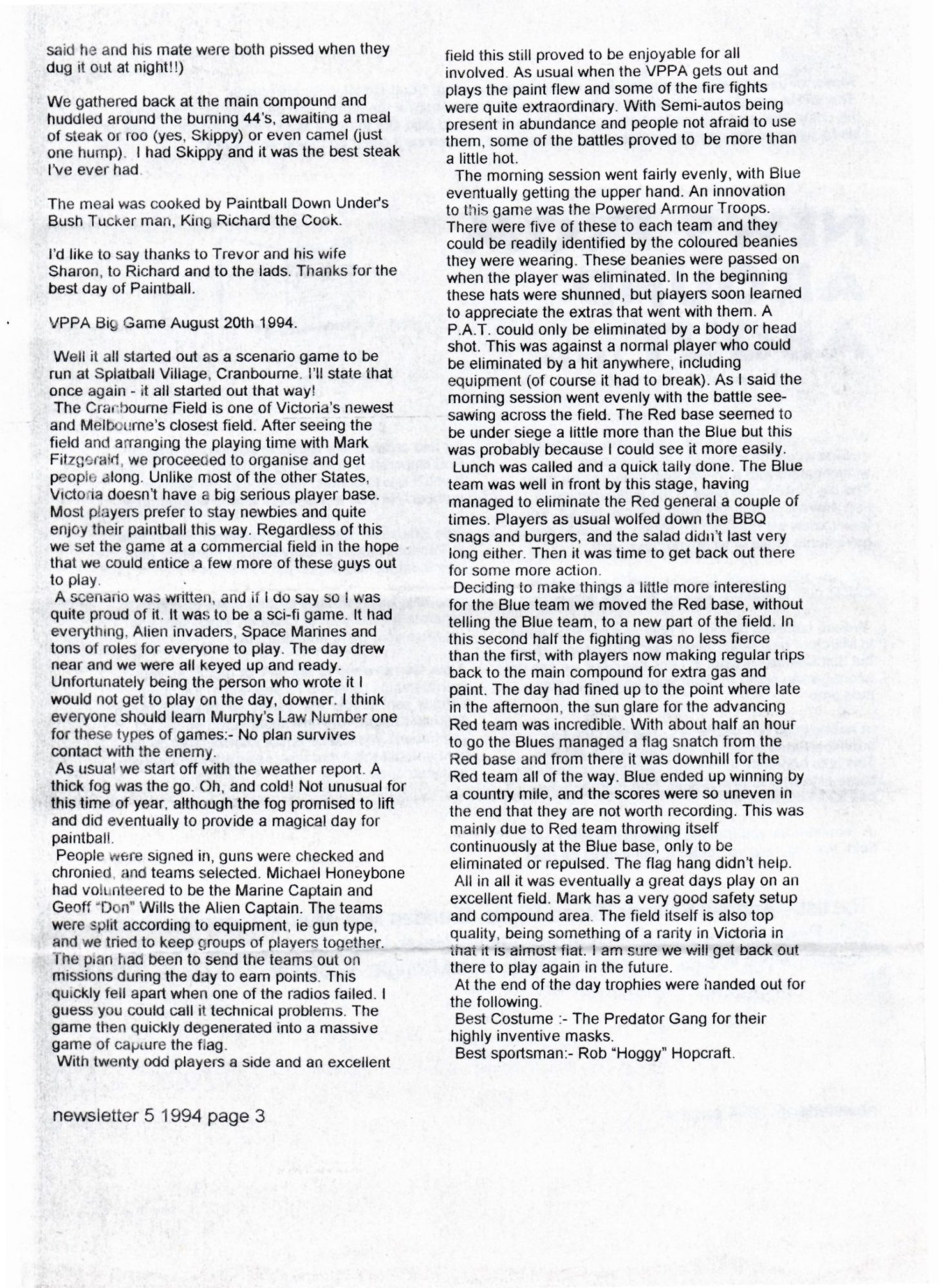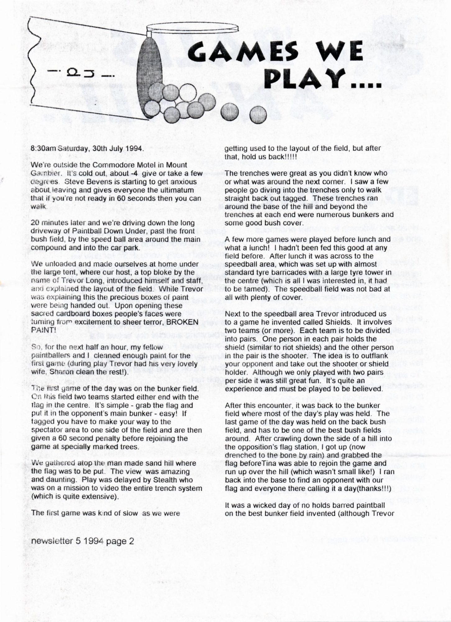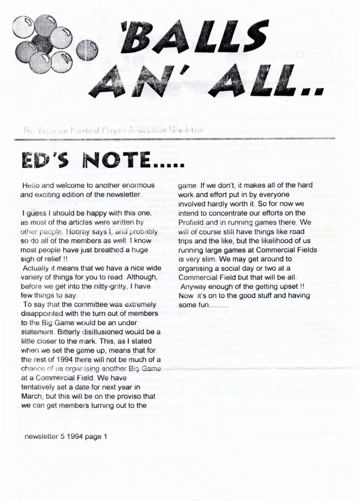 Here’s a copy of the Victorian Paintball Players Association (VPPA) newsletter ‘Balls An’ All From mid 1994. The VPPA were an Australian players association based in Melbourne in the 1990’s. The paintball scene in Victoria, Australia was really taking off at this time. There were tournaments, road trips, club days and social events. It was a great time to be involved with paintball.