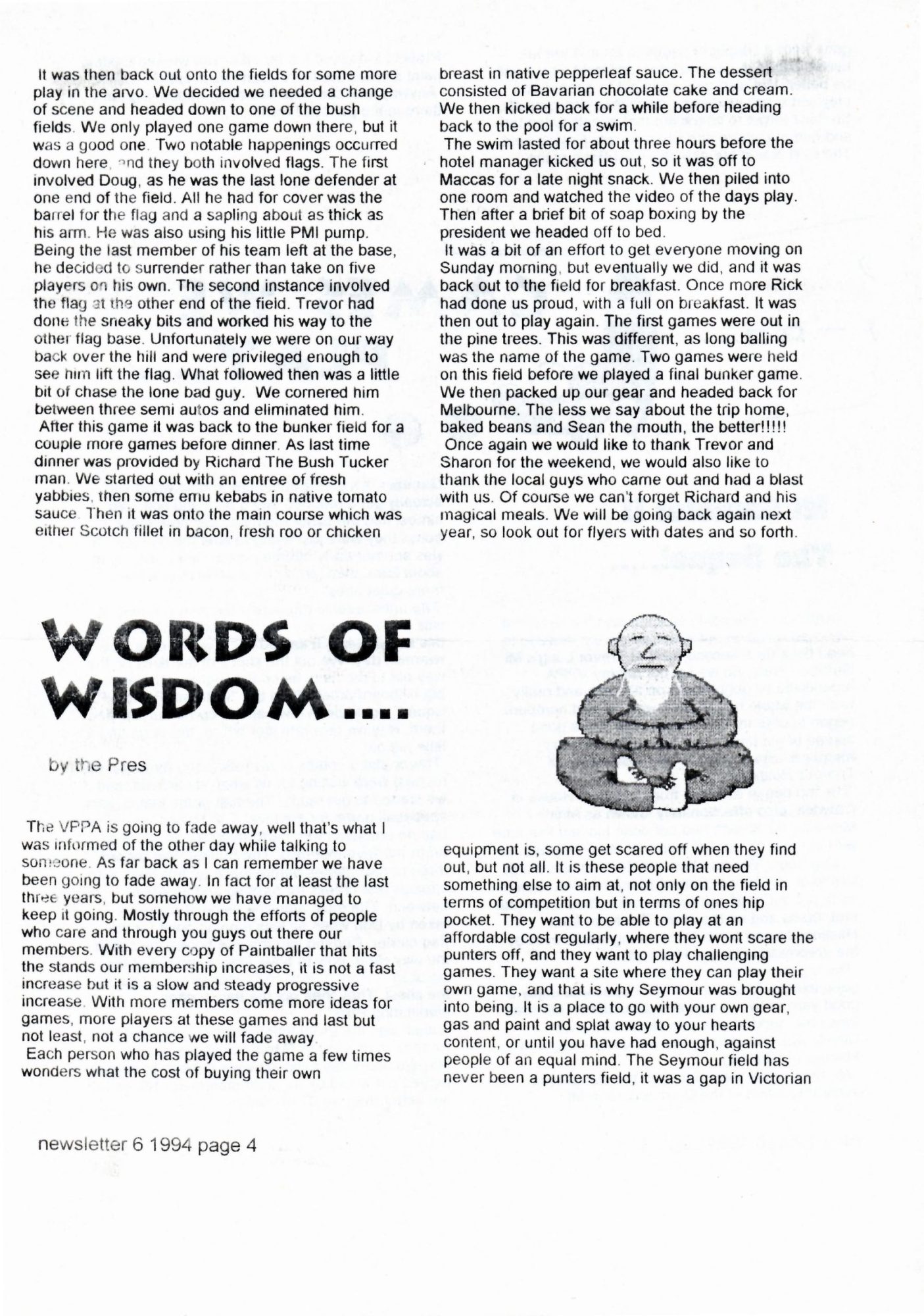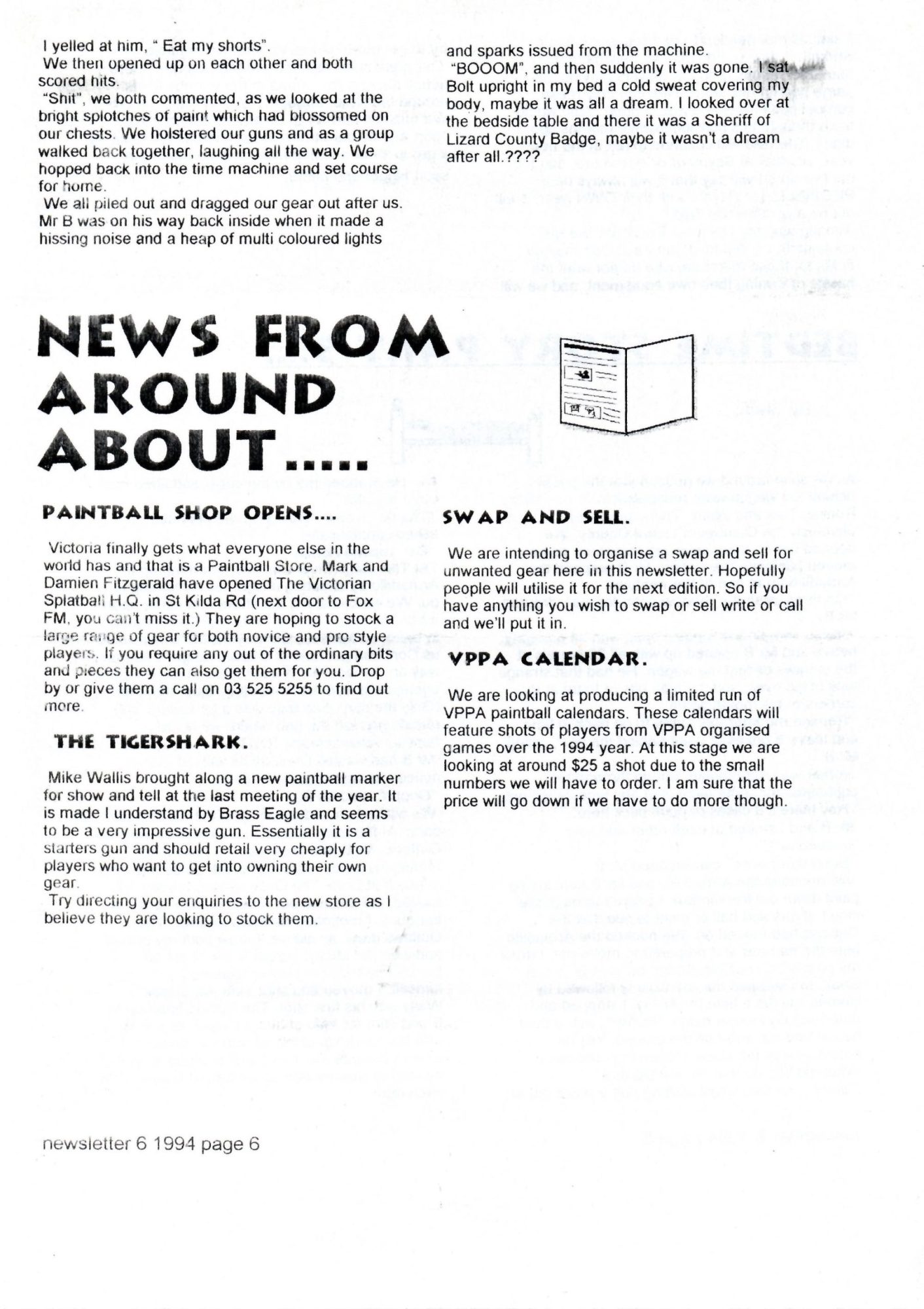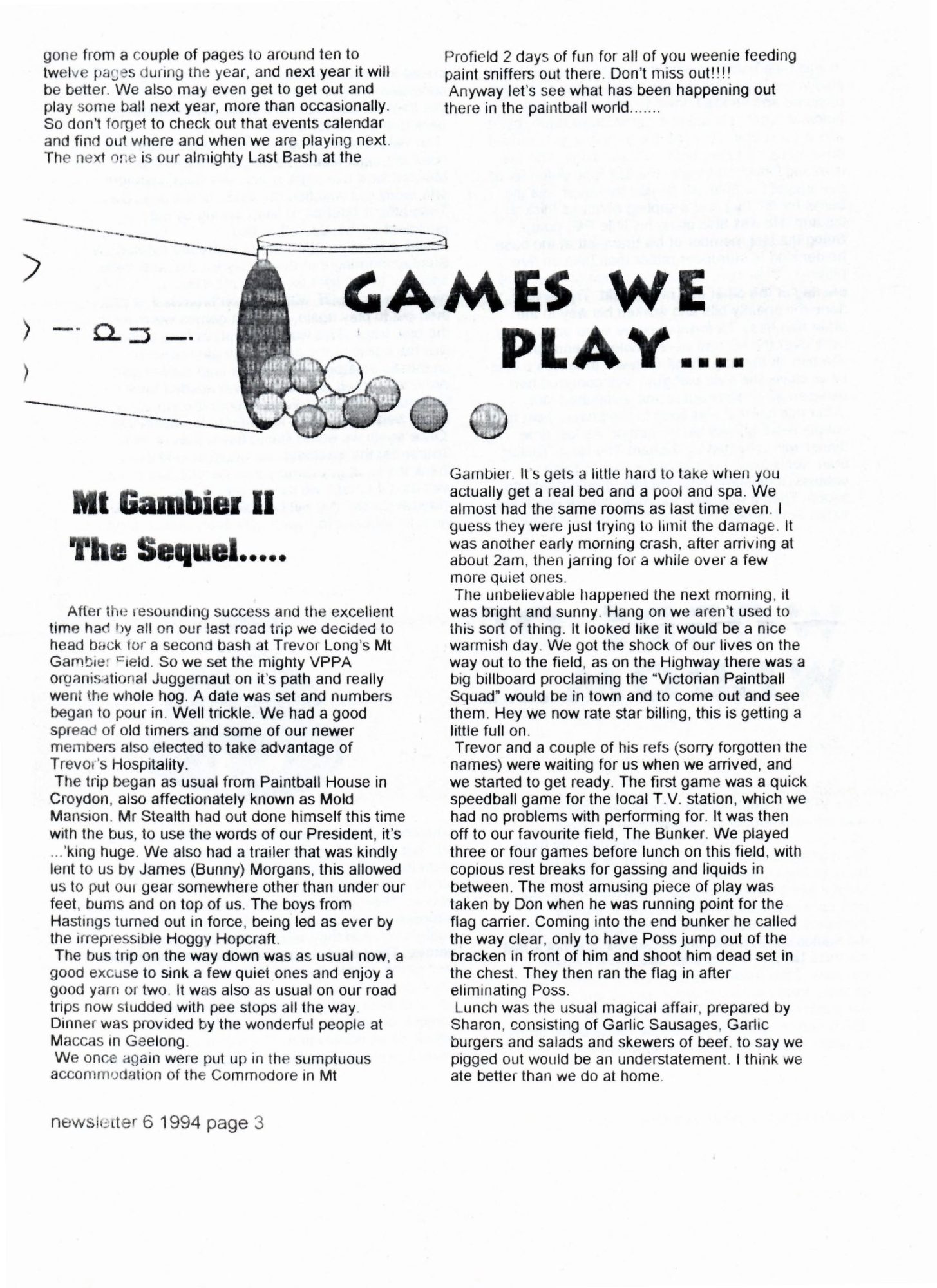 Here’s a copy of the Victorian Paintball Players Association (VPPA) newsletter ‘Balls An’ All From mid 1994. The VPPA were an Australian players association based in Melbourne in the 1990’s. The paintball scene in Victoria, Australia was really taking off at this time. There were tournaments, road trips, club days and social events. It was a great time to be involved with paintball.